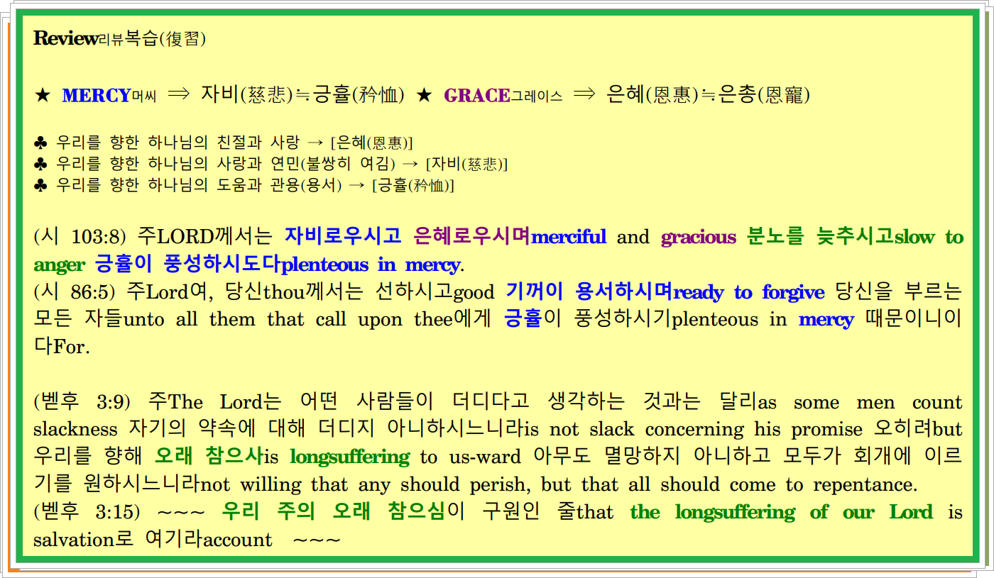 (벧후 3:9) 주The Lord께서는 ~~~ 아무도 멸망하지 아니하고 모두 회개로 오기를 원하시며not willing that any should perish, but that all should come to repentance 우리를 향해to us-ward 오래 참으시느니라is longsuffering롱써퍼링