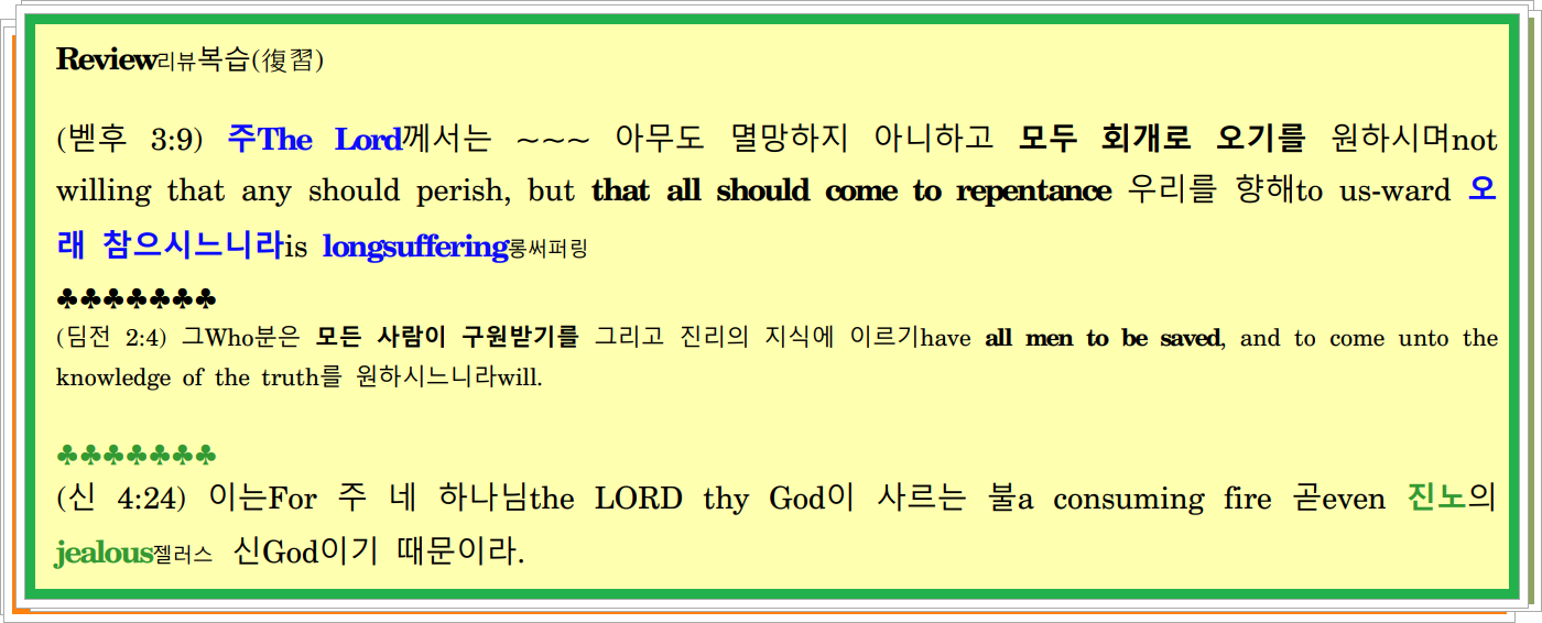 (롬 2:4-5) 혹은Or 하나님의 선하심이 너를 회개로 이끄심을 알지 못한 채not knowing that the goodness of God leadeth thee to repentance 네가 그분의 선하심과 자제하심과 오래 참으심의 풍성함을 멸시하느냐despisest thou the riches of his goodness and forbearance and longsuffering? / 5 오직But 너의 완고함과 뉘우치지 아니하는 마음에 따라after thy hardness and impenitent heart 진노와 하나님의 의로운 심판이 나타나는 날에대해against the day of wrath and revelation of the righteous judgment of God 네자신에게 진노를 쌓아 올리는도다treasurest up unto thyself wrath.