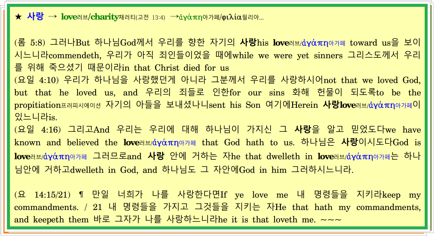 ♣ 우리를 향한 하나님의 아끼고 베풀며 따뜻하게 여기는 마음 → 사랑 → LOVE러브/CHARITY채러티 → ἀγάπη아가페/φιλία필리아...