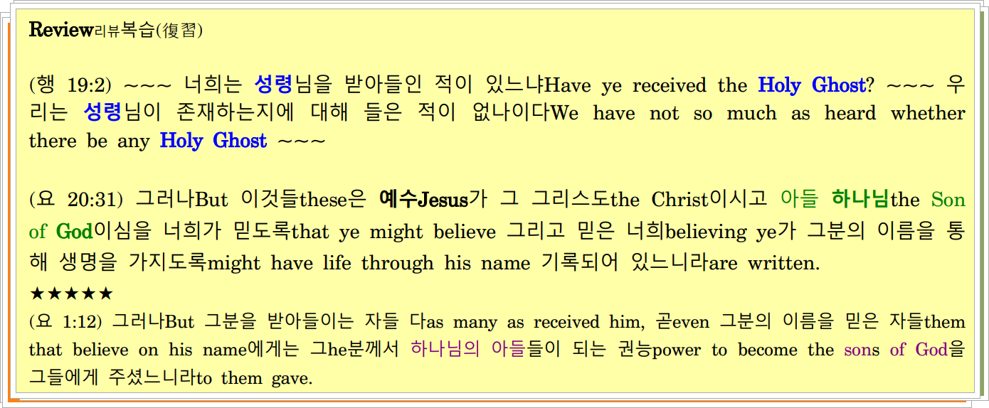 (요일 1:7-9) 그러나But 그분이 빛 가운데 계신 것 같이as he is in the light 만일 우리가 빛 가운데서 걸으면if we walk in the light 우리에게는 서로간에 친교가 있고we have fellowship one with another, and 그분의 아들 예수 그리스도의 피가 모든 죄에서 우리를 깨끗하게 하느니라the blood of Jesus Christ his Son cleanseth us from all sin. / 8 만일 우리가 우리에게는 죄가 없다라고 말하면If we say that we have no sin 우리는 우리 자신들을 속이느니라we deceive ourselves, 그리고and 진리가 우리안에 있지 않느니라the truth is not in us. / 9 만일 우리가 우리의 죄들을 자백하면If we confess our sins 그분은 신실하시고 의로우사he is faithful and just 우리에게서 우리의 죄들을 용서하시며to forgive us our sins, and 모든 불의에서 우리를 깨끗하게 하시느니라to cleanse us from all unrighteousness. / 10 만일 우리가 우리는 죄지은 적이 없다고 말한다면If we say that we have not sinned 우리는 그분을 거짓말쟁이로 만드니라we make him a liar