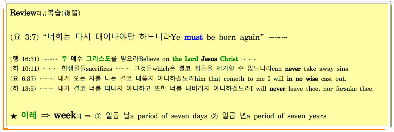 (출 12:15-16/18) 너희는 칠일/이레 동안Seven days 누룩 없는 빵unleavened bread을 먹을 것이요 ~~~ / 16 첫째 날에in the first day 거룩한 집회an holy convocation가 있으며 일곱째 날에도in the seventh day 너희에게 거룩한 집회an holy convocation가 있으리니 이 날들에는 ~~~ 아무 일도 하지 말고no manner of work shall be done in them ~~~ / 18 ¶ 첫째 달 그 달 십사일 저녁부터In the first month, on the fourteenth day of the month at even 그 달 이십일일 저녁까지until the one and twentieth day of the month at even 너희ye는 누룩 없는 빵unleavened bread을 먹을지니라shall eat