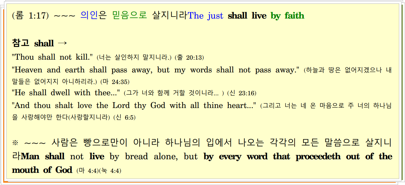 (롬 5:1) ~~~ 믿음으로 의를 받은 우리being justified by faith, we에게는 우리의 주 예수 그리스도를 통한 하나님과의 평강이 있도다have peace with God through our Lord Jesus Christ